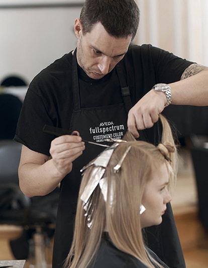 “When imagining the best color for a person, I always look carefully at their features,” says Black. In fact, he has developed a technique called “Eclipting™” that can be compared to facial contouring, but for the hair. “There’s been a lot of talk of contouring for faces. It’s all aimed at bringing out the best in somebody. In the past, we’ve always talked about what tones or color palette will flatter someone. But this technique is more like framing, and if you think about a photo, whenever you stick it in a frame, it pops more,” says Black. “With the Eclipting™ service, I’m using Aveda hair color to create subtle shading placed under a fringe, or around the hairline if there are no bangs, to gently frame the face and bring out what’s beautiful about the individual.”