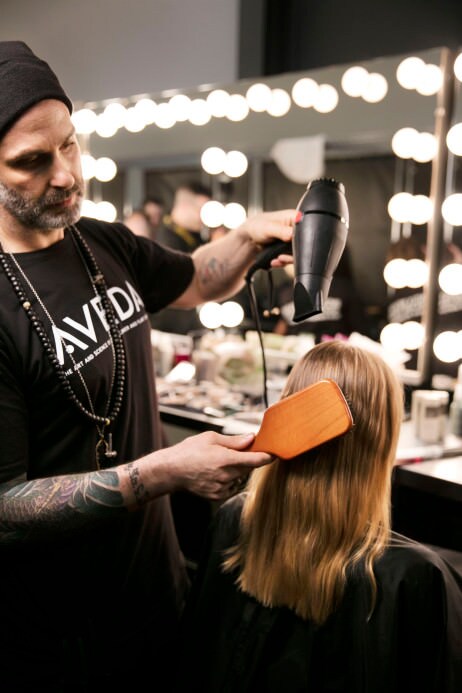 Aveda Guest Artist, Jon Reyman, creates messy-neat “French girl” hair at the Hellessy Spring/Summer 2017 Show at Pier 59 Studios.